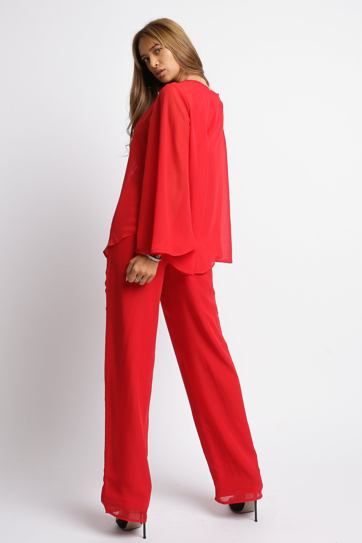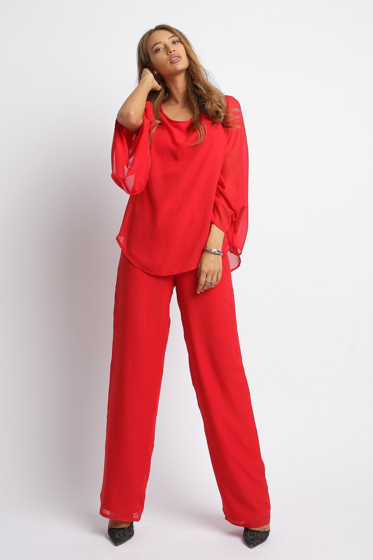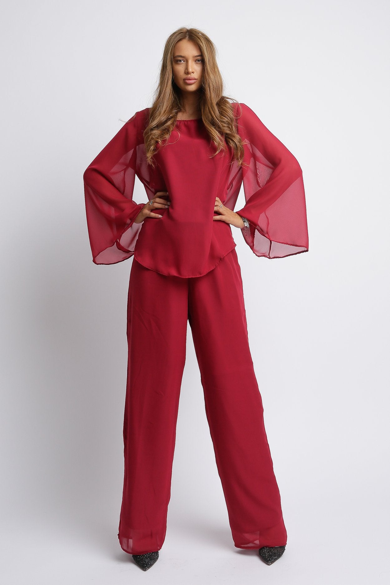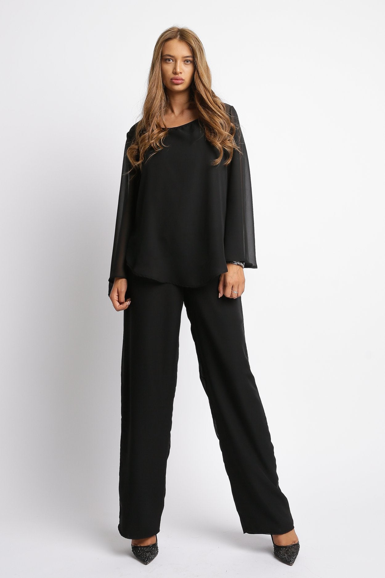 Compleu Monica – Eleganță și Confort într-un Set Modern Îmbină stilul și confortul cu Compleul Monica, realizat dintr-o combinație delicată de voal și jerse (90% poliester, 10% elastan), care asigură libertate de mișcare și un fit plăcut. Pantalonii au lungimea de 93 cm și talie elastică, pentru un plus de confort și adaptabilitate, fiind ideali pentru ținute casual sau elegante.