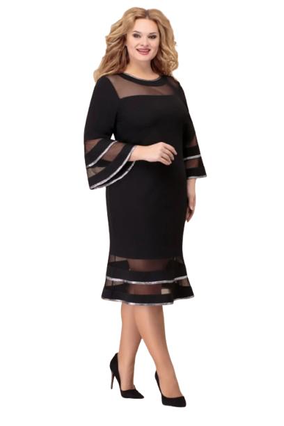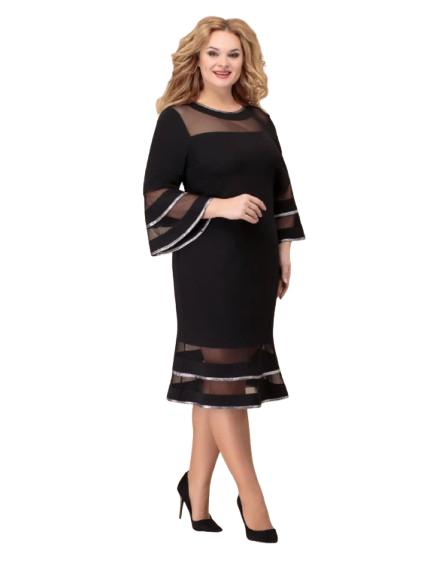 Descriere produs – Rochie neagră cambrată cu inserții de voal, bandă argintie și mâneci clopot: Rafinată și elegantă, această rochie...