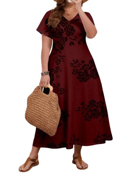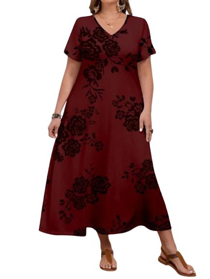 Descriere produs – Rochie lungă bordo cu imprimeu negru de trandafiri: Elegantă și feminină, această rochie lungă bordo este accentuată...